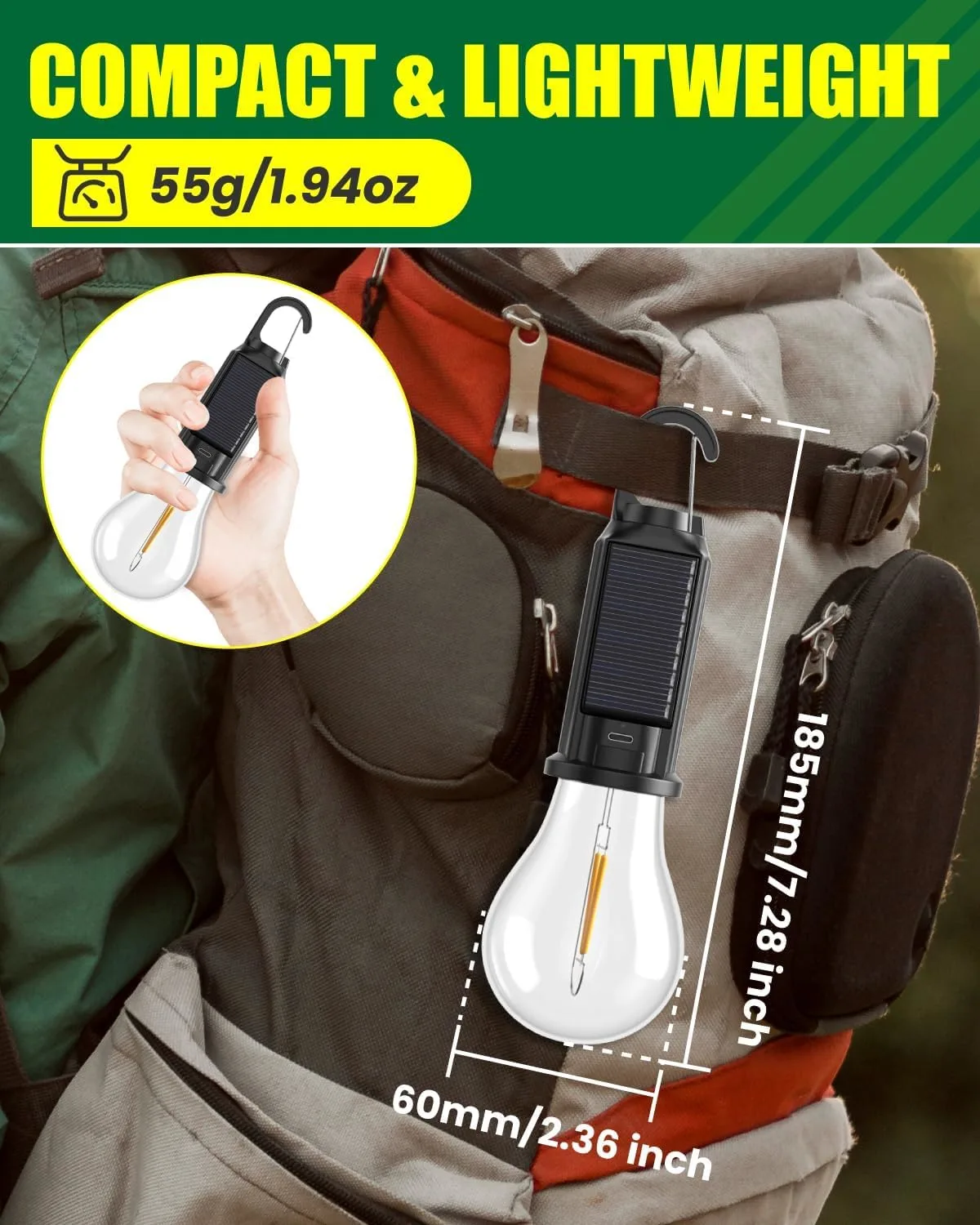 Rechargeable & Solar Powered Camping Light—This multifunctional LED bulb features a built-in 400mAh 14500 lithium battery with dual charging options: fast Type-C and solar charging. It offers 2.5–10 hours of runtime for uninterrupted outdoor adventures.
