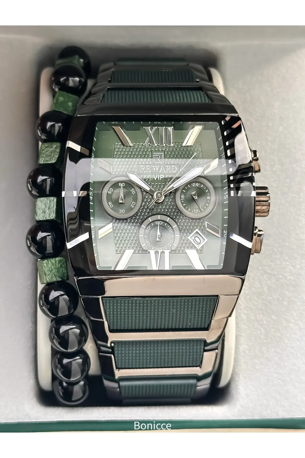 This premium square dial chronograph watch is designed for those who appreciate bold aesthetics combined with everyday practicality. The strong square-shaped case instantly sets it apart from ordinary round watches, giving it a confident and modern presence on the wrist. The detailed dial layout, accented with multiple sub-dials and clear hour markers, creates a refined yet powerful look that works equally well with casual outfits or formal attire. Its balanced proportions make it eye-catching without feeling oversized, delivering a statement style that feels intentional and well-crafted.