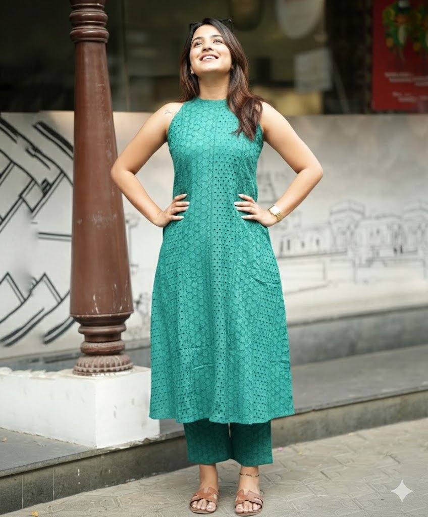 A sophisticated profile shot showcasing a sleeveless, high-neck A-line kurta paired with matching cropped trousers. The intricate eyelet embroidery adds a delicate texture to the vibrant teal fabric. Captured in a graceful ‘smile over shoulder’ pose, the look balances modern street style with traditional craftsmanship.