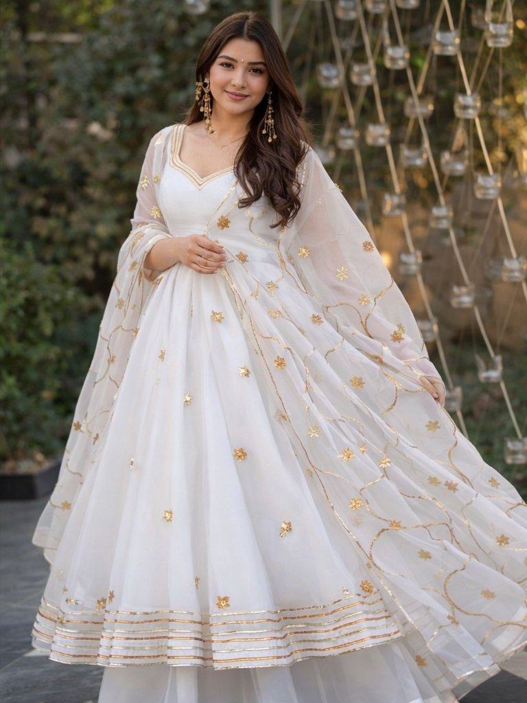 Elegant White & Gold Anarkali Gown with Dupatta
