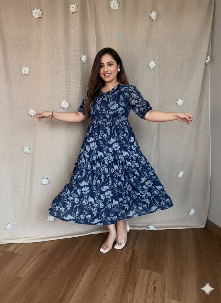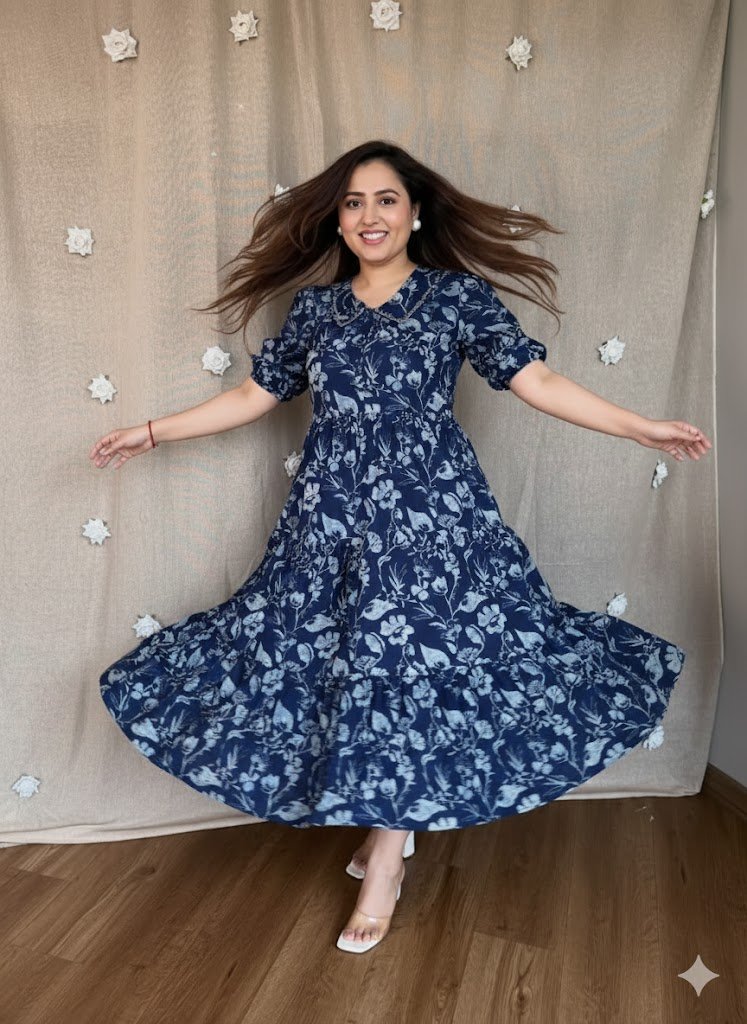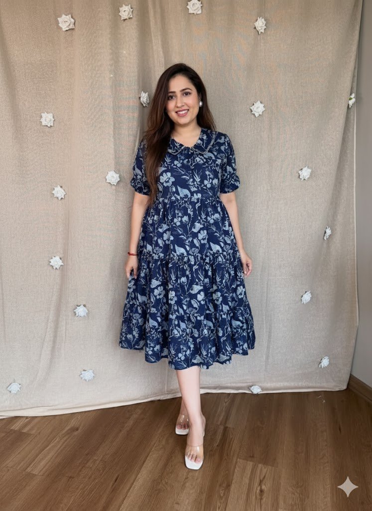 Capture the essence of effortless grace with every turn. This stunning midnight blue midi dress is a masterclass in combining traditional indigo aesthetics with a playful, modern silhouette. Featuring a flirty tiered design that’s made for movement, this dress is the perfect companion for everything from a festive celebration to a weekend brunch.