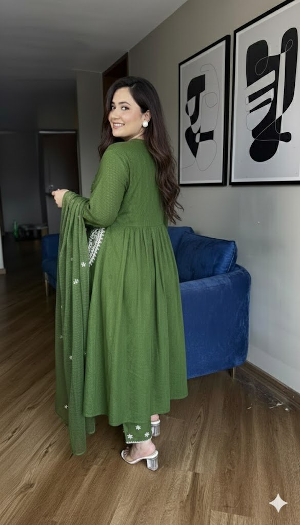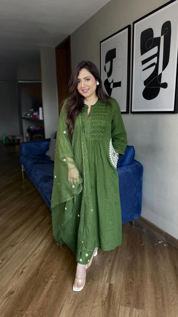 Grace meets comfort in this stunning forest-inspired silhouette. This olive green ensemble is designed for the modern woman who appreciates understated luxury. Crafted from a textured cotton-silk blend, this outfit is as breathable as it is beautiful, making it a perfect choice for festive lunches, intimate gatherings, or evening celebrations.