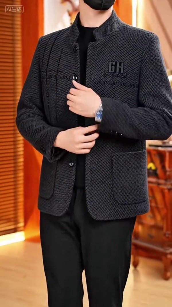 Contrast Piping: Sharp black piping or trim defines the edges of the generous patch pockets and other structural lines, emphasizing the jacket’s tailored shape.