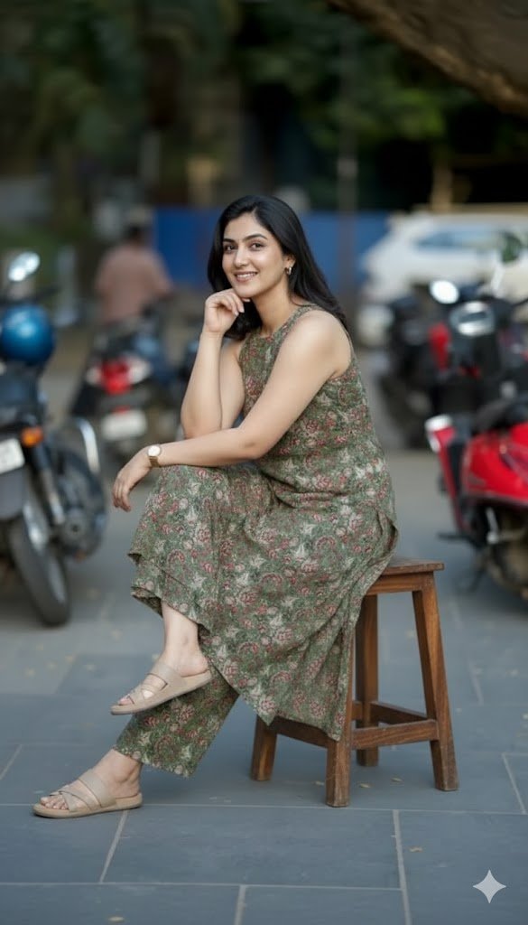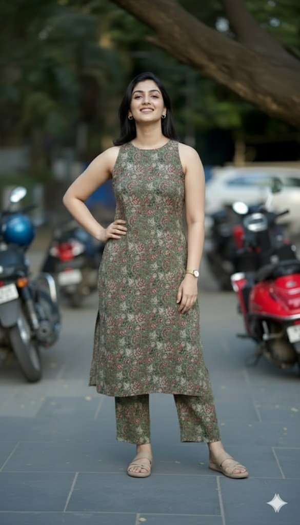 Confidence isn’t just a look; it’s an attitude. 🌿✨ Taking a moment to look up and soak in the city vibes in this stunning olive green coordinated set. The intricate block-print patterns bring a touch of tradition to the modern streets. Keep your chin up and your style sharp.”