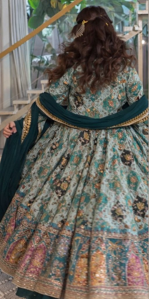 The flattering V-neck wrap-style bodice enhances the silhouette, while the heavy flare creates a grand and flowy appearance. Paired with a contrasting deep green dupatta detailed with golden lace border, this ensemble is perfect for weddings, receptions, festive celebrations, sangeet nights, and special occasions.