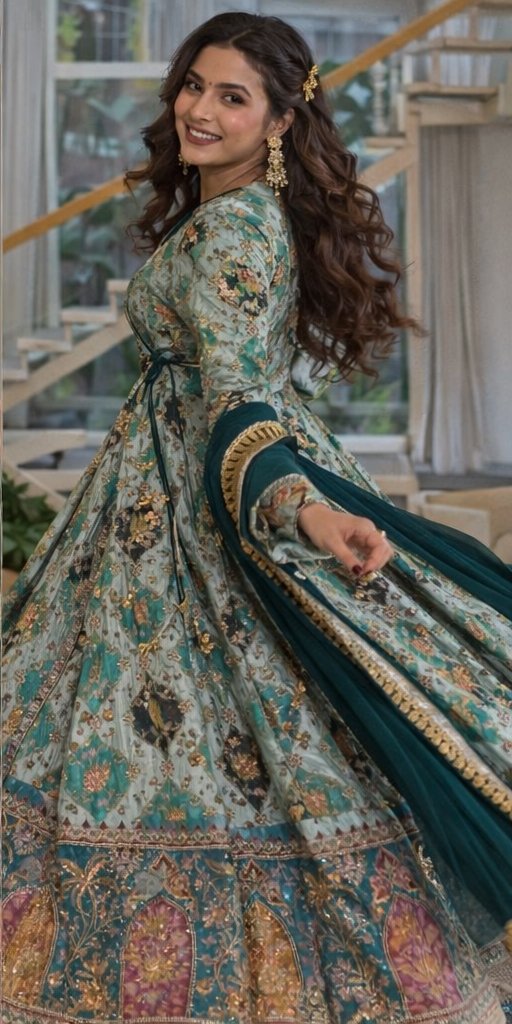 Step into timeless elegance with this stunning Sea Green Designer Anarkali Gown Set, crafted to give you a royal and graceful look. The outfit features intricate traditional prints with rich multicolor detailing at the hemline, adding a luxurious ethnic touch.