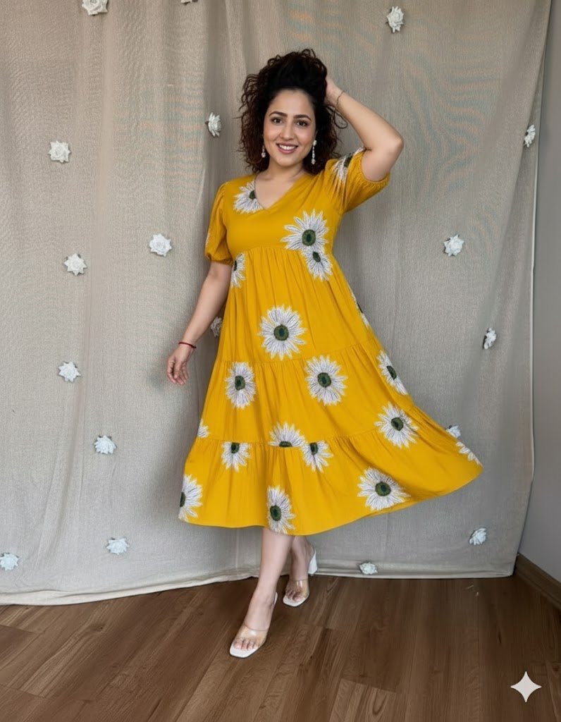 Radiate positivity in this vibrant sunshine yellow midi dress. Designed to capture the essence of a bright summer day, this dress combines a bold floral aesthetic with a relaxed, breezy silhouette. The cheerful yellow hue and iconic sunflower print make it an instant mood-booster for your daytime wardrobe.