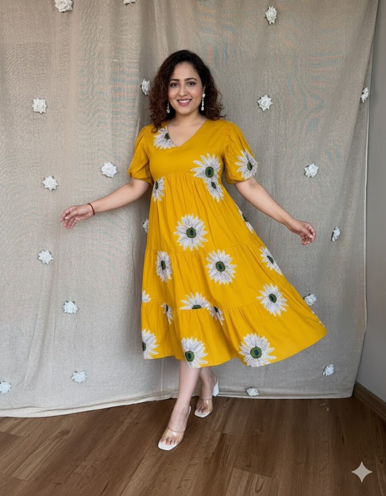 Design: A three-tiered midi dress featuring a high-waisted empire line that flows into a voluminous, flouncy skirt.
